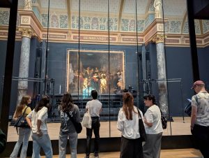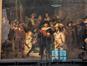有名なレンブラントの夜警は、今はガラスの部屋で修復中(右側)です。